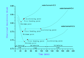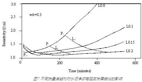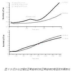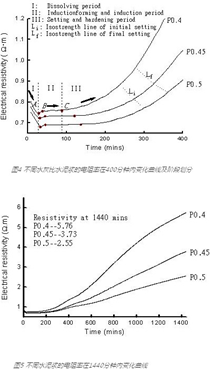 電阻率隨時(shí)間的發(fā)展曲線是水泥石結(jié)構(gòu)形成的映射,所以可望與水泥的凝結(jié)時(shí)間以及其他力學(xué)性能建立關(guān)系。如果通過(guò)多種不同水泥和多種減水劑的試驗(yàn),還可以用于判斷水泥和減水劑的相容性。