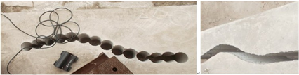 從上圖可以看出,在縮小測(cè)試區(qū)域并加密測(cè)線的區(qū)域內(nèi),在0.3米高度,橫向坐標(biāo)5~37cm區(qū)域的管道處厚度確實(shí)明顯增大,預(yù)應(yīng)力管道內(nèi)灌漿存在不密實(shí)的情況。為了進(jìn)一步證實(shí)IES掃描式?jīng)_擊回波測(cè)試得到的結(jié)果,在測(cè)試得到的缺陷的位置,鑿開(kāi)混凝土,露出管道內(nèi)的灌漿情況,在三維圖顯示缺陷的位置,鋼筋束已經(jīng)腐蝕生銹,管內(nèi)只在底部有少量的灌漿,其他部位均沒(méi)有漿體包裹,存在壓漿嚴(yán)重不密實(shí)那個(gè)。如下圖所示 :