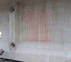 規(guī)劃好要測(cè)試的腹面部位后,畫(huà)出1.1x 1 米測(cè)試范圍,并每隔10厘米標(biāo)出每條測(cè)線。這個(gè)測(cè)試范圍包含三條預(yù)應(yīng)力管。如左圖所示。