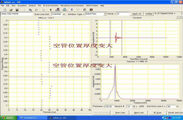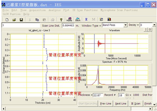 我們看到,在管道位置,由于只有七天齡期,管道內(nèi)凈漿強(qiáng)度估計(jì)只有M30左右,強(qiáng)度沒(méi)有管道外混凝土腹板強(qiáng)度高,所以測(cè)出來(lái)的計(jì)算厚度偏大,只有22cm左右,沒(méi)有空管那么明顯。管道外的腹板測(cè)出來(lái)的厚度大概在20cm左右,與腹板的實(shí)際厚度相符。